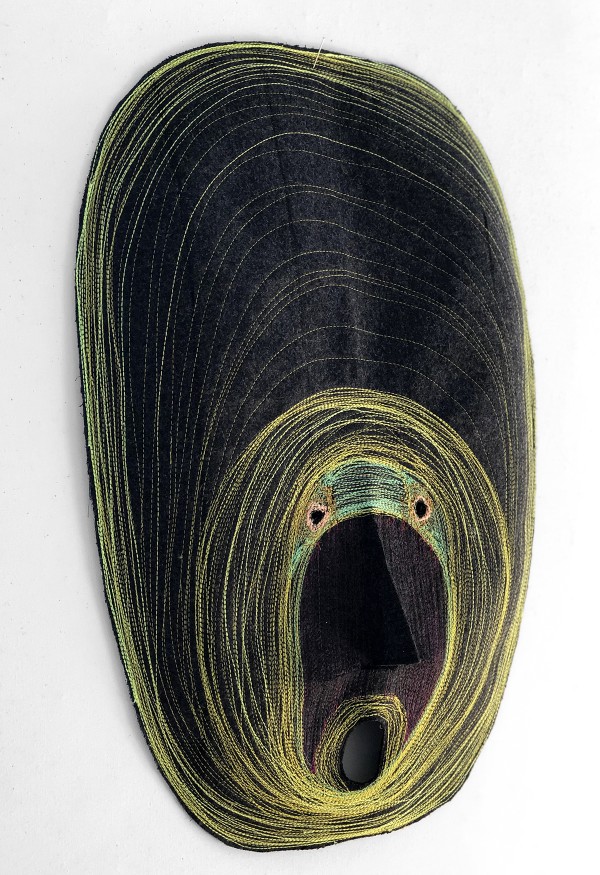 “I used to draw emojis and organic shapes with intricate lines using emotion color wheels for inspiration. These drawings were the basis for “Masked Feelings,” a series of stitched caricatures encouraging interaction, selfreflection, and self-discovery. Which mask can you relate to? Anxious, sad, depressed, joyful, quiet… It gives us permission to explore our ambiguous relationship to others, and to ourselves.”