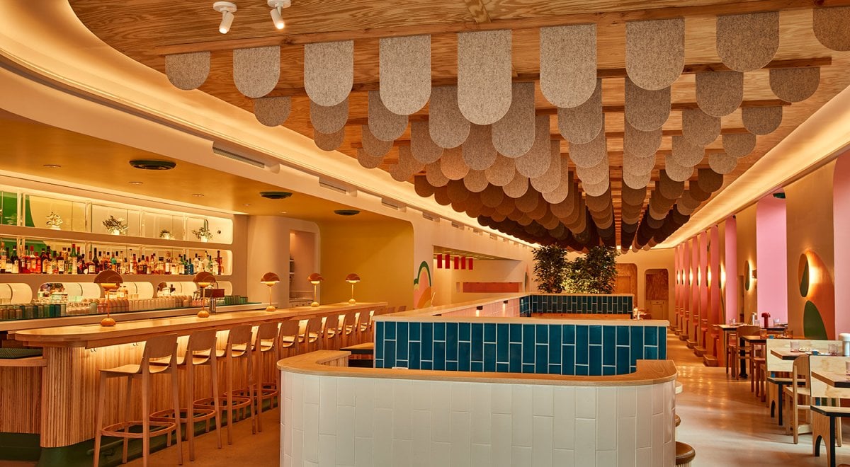 At Kpod restaurant in Philadelphia, soft, rounded shapes and a playful color palette come together with K-pop references to set a happy tone for the restaurant’s eclectic Korean-American menu. Lance Saunders, Director of Design at Philadelphia-based Stokes Architecture + Design, swaps out the previous space’s glossy white and “Stanley Kubrick-looking” aesthetic for fun silhouettes and saturated colors. Rows of ceiling-mounted custom cut 5mm-thick felt in an earthy palette set contrast to the colorful tiled surfaces and play up the space’s fun and lively ambiance while helping to temper sound in the bustling restaurant.