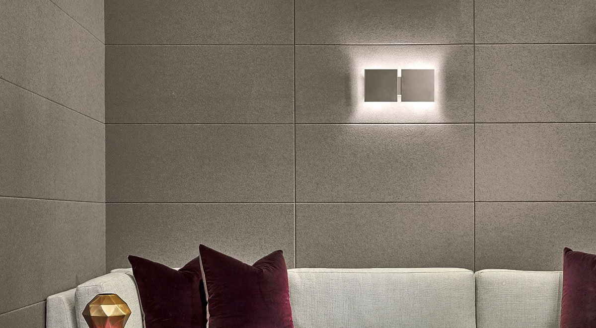 In this media room in a Miami Beach private residence, the high-end finishes create a serene, luxurious space perfect for curling up with a good flick. Akustika 10 Wall panels in a neutral and natural light grey cover three walls of the room to provide the necessary acoustics. Seaming between the panels creates interest with a strong geometric rhythm and since Akustika 10 Wall is available in custom sizes and options, its flexibility fits just about any space and design.